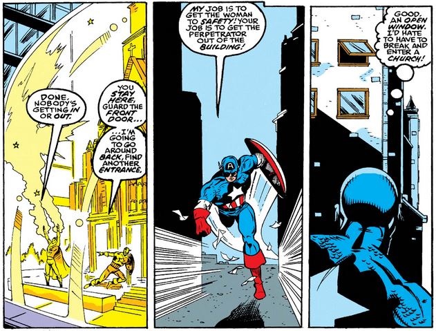 Quasar is able to track Nefarius’ energy readings to a church, which Cap has him seal off before assigning duties and then finding a way inside without having to damage the structure.