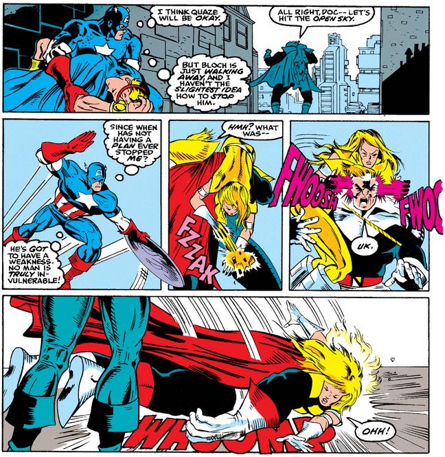 Cap gets Karla out of the church while Quasar fights Lloyd inside… and then outside, much to Cap’s dismay, which Karla tries to take advantage of, but to no avail. (I wonder if he had to hold back with that elbow blow, considered his serum-less state.)