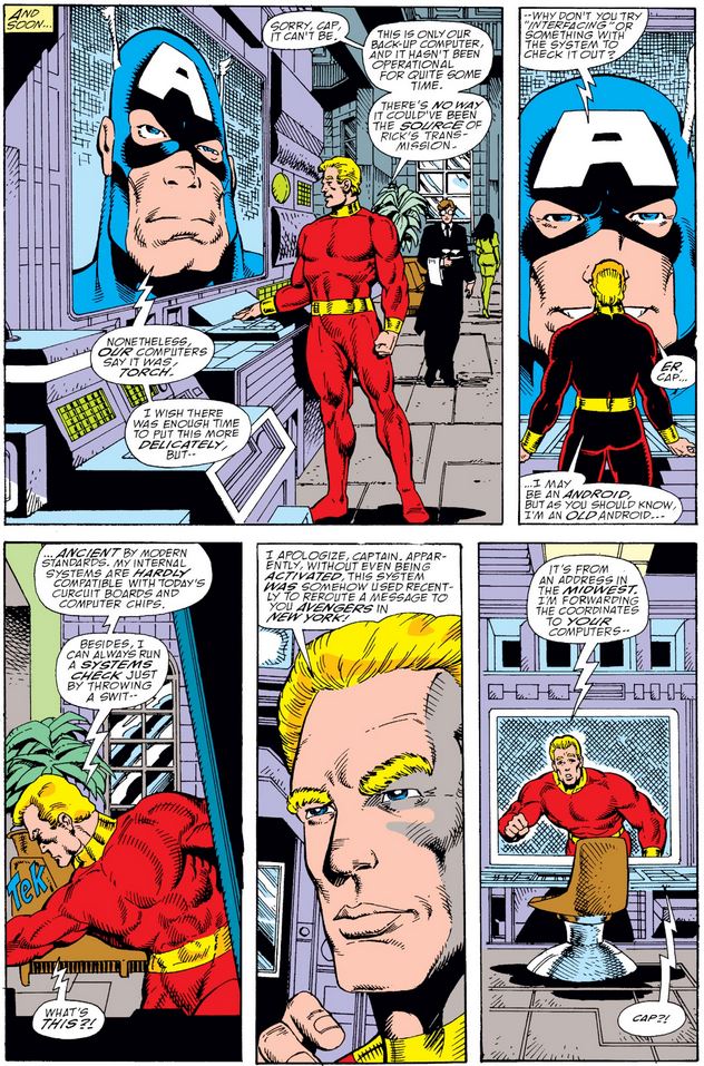 …he rings them up and Jim answers, explaining to Cap that, although he is a vintage model synthezoid, he can push a button with the best of them.