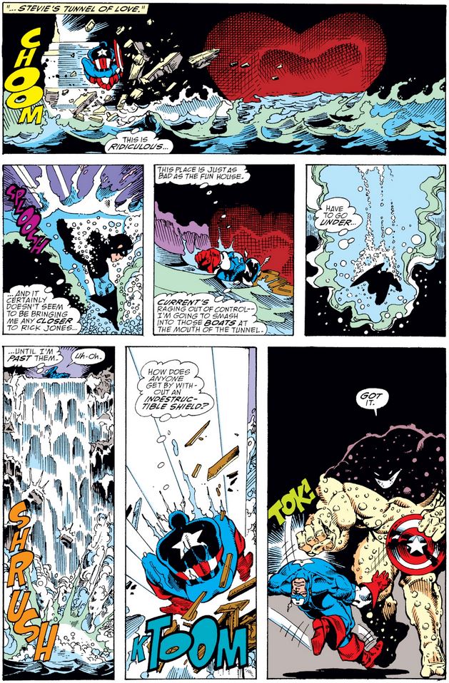 Cap finds himself expelled from the fun house into a rampaging tunnel of love, and is grateful as ever for his trusty shield… until someone snatches it.