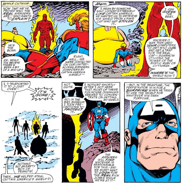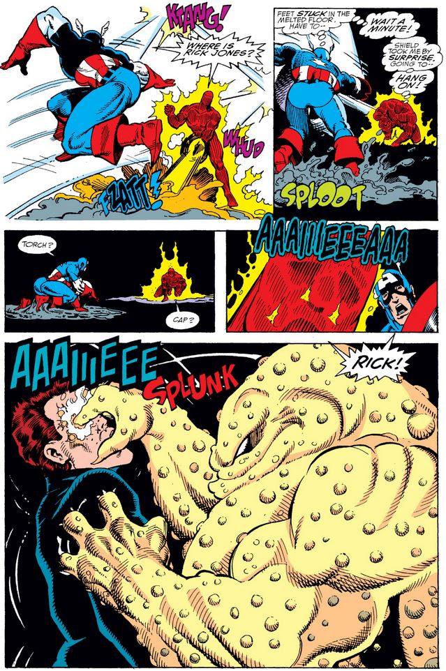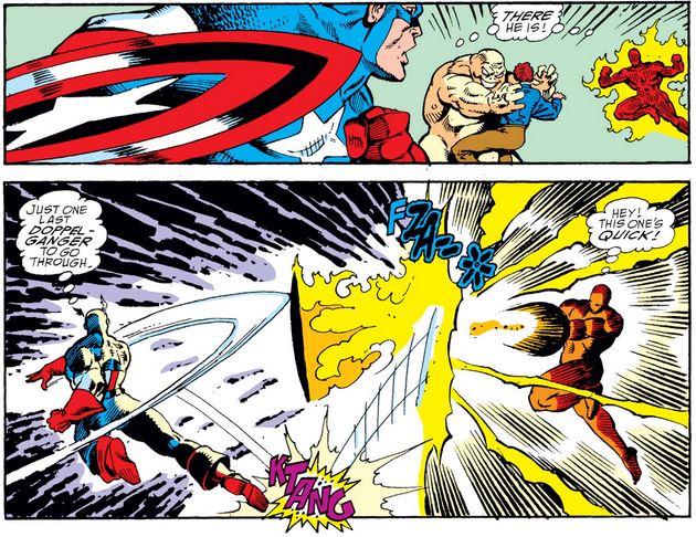 Neither Cap nor the Torch is fooled by the fakes of their friends and enemies, even though they have some of their powers, but when they see the monster grabbing Rick again, each thinks the other is a fake as well, so they attack each other.