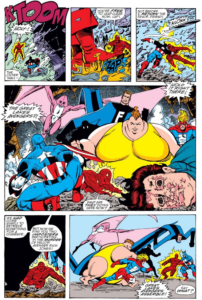 The two Invaders manage to free each other, only to confront the greatest threat yet: the Great Lakes Avengers, who were introduced in issue #46 and appeared in issue #49 (but not in the panels we covered). And of course, they think Cap and Torch are fakes too.