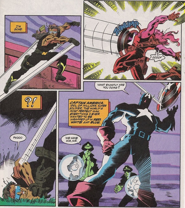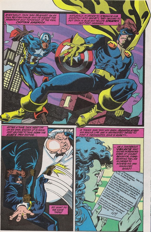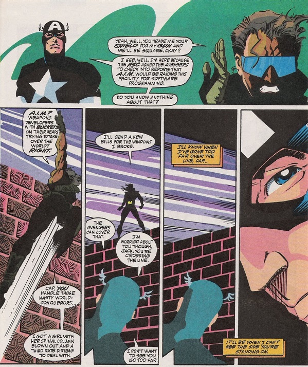 After Cap explains why he happened to be there, Jack makes a similar argument that Rage recently made in Avengers #326: that he’s looking after the “little people” Cap and the Avengers ignore while they tackle global threats (which, of course, are also of interest to the little people).