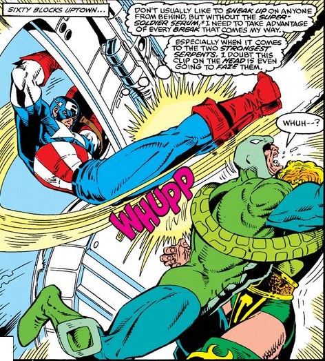 Rachel storms off and contacts the mercenary Paladin for help rescuing her friends before Cap can storm the Serpent Society… but Cap is staking out her apartment, where he finds two members waiting for her. He regrets his sneak attack, but justifies it by reference to his diminished strength due to his loss of the super-soldier serum in issue #377.