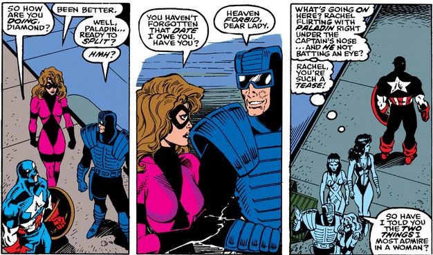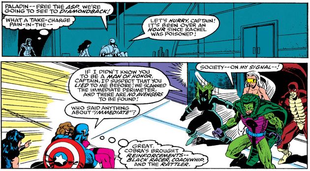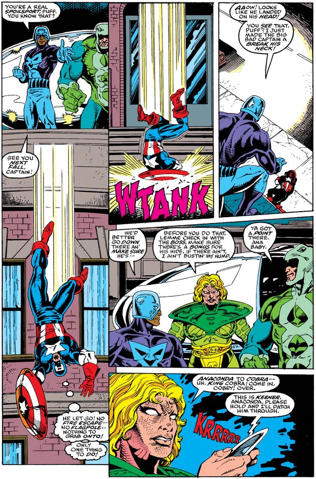 That note Bernie sees leads to something that will be picked up in issue #385… but for now, let’s get back to Cap’s continued fight through the Serpents, until he finally finds Diamondback and Her Amazing Friends (including “this guy–Paladin”).