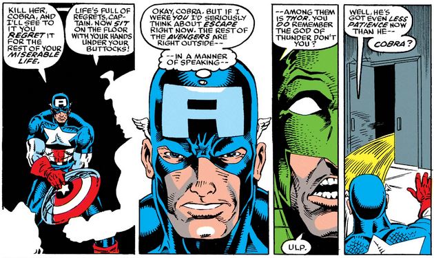 I didn’t hear anybody mention rights, but Cap lands a nice one nonetheless before Cobra slithers to Diamondback and threatens her life…