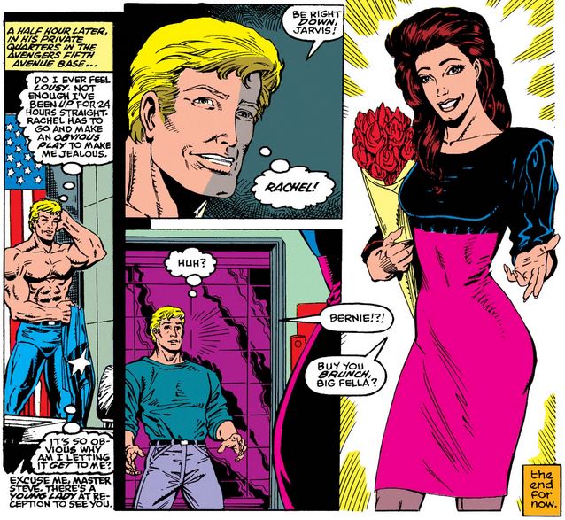 Meanwhile, Cap was reunited with his ex-fiancée, Bernie Rosenthal, which has his mind in a whirl, as we see in issue #381 while he grabs a bite at a local diner with John Jameson. To his credit, he still regrets keeping his relationship with Rachel from Bernie (as noted in the last issue).