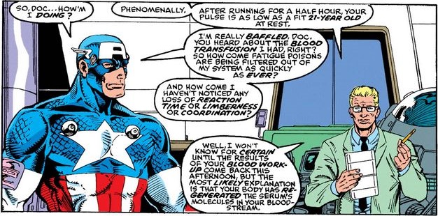 To be honest at the time the idea that the SS serum had always stayed in his body afterward seemed strange to me. So I really didn’t care for them making such a big issue of the whole thing becuase to me it would have left his system soon after it transformed him. (I know it makes the whole “frozen in ice” thing more plausible but… comics!)