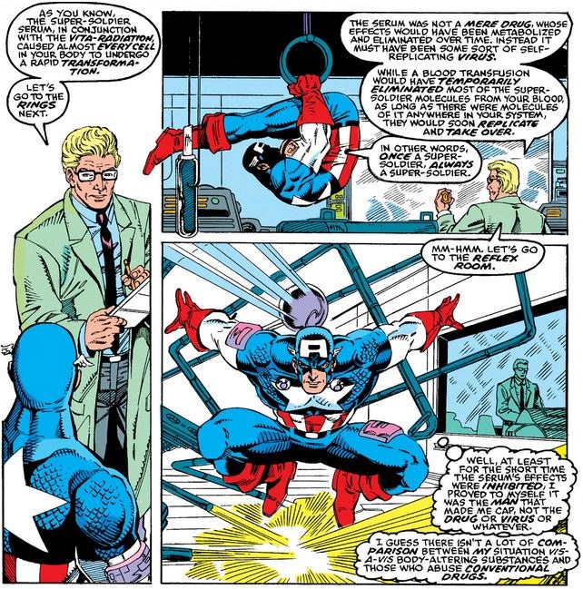 Besides the obvious, Cap is relieved both that he had a chance to prove to himself (in issue #378) that he didn’t need the serum while it was depleted, and that the super-soldier serum has even less in common with recreational and performance-enhancing drugs than he thought. (This second point was never a significant concern, but it is hard to see how its self-maintaining ability affects that comparison—if anything, it makes the super-soldier serum a more dangerous analogue of other drugs.) So, not only does this resolve a change in the character that I doubt anyone really wanted, but it also put Cap’s mind to ease… always a good thing!