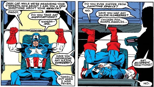 …until Dr. Kincaid hits on a concern somewhat unique to Cap (and very Gruenwaldian), which prompts some reminiscing on events recounted many times since Avengers #4.