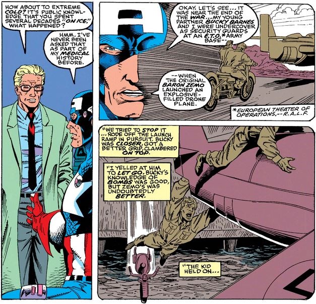 We do get a few new details about Cap’s impressions as he fell through the air and into the frigid waters below, making the episode more terrifying than it seemed in previous recountings.