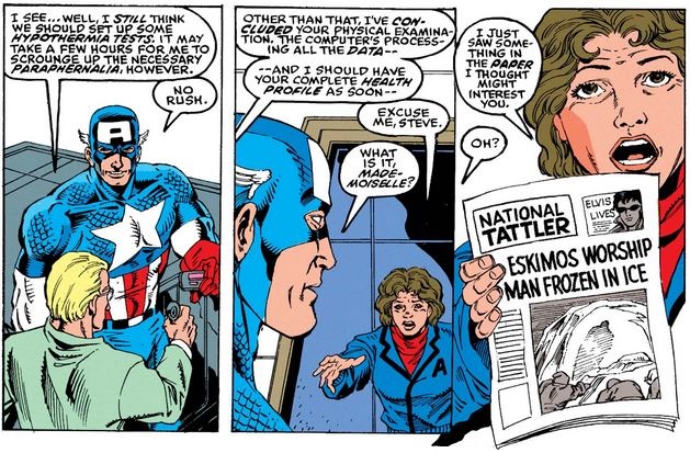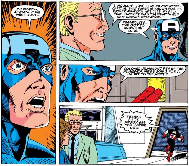 This starts Cap thinking that D-Man may actually be alive (but not Bucky, no way, he definitely blowed up, not possible), and when Peggy Carter shows up with the latest tabloid, it just adds fuel to the fire.