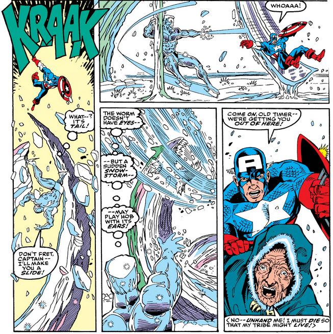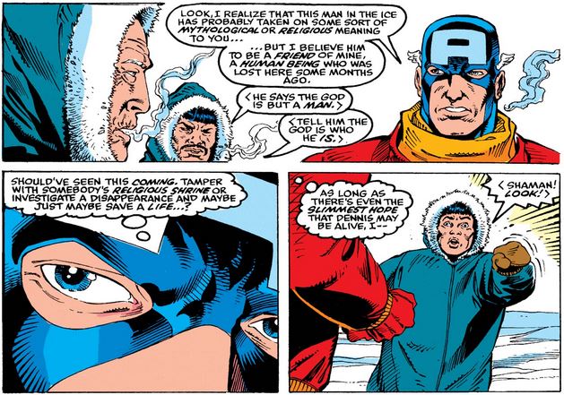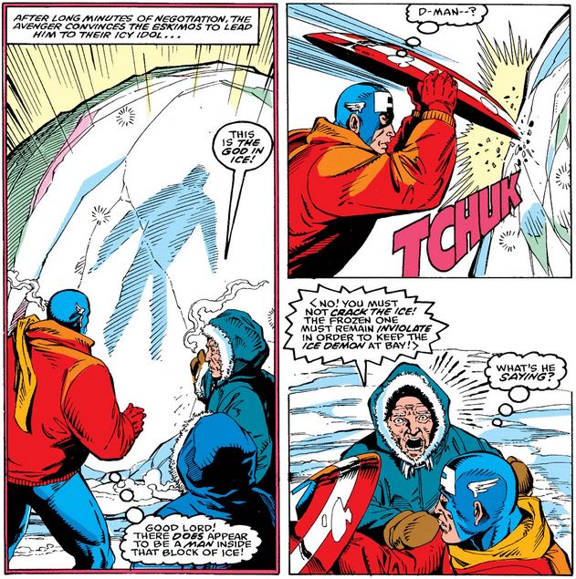 Once there, Cap rides his sky-cycle to the ground and asks two indigenous men—one of them a shaman—to show him the frozen man, and when Cap starts to free him, the shaman begs him to stop (albeit in his native tongue).