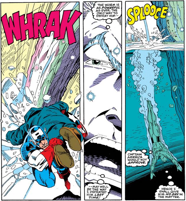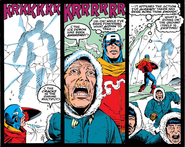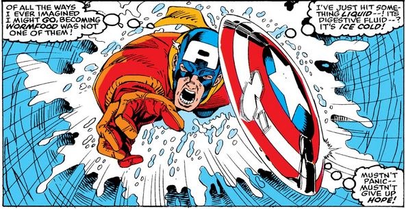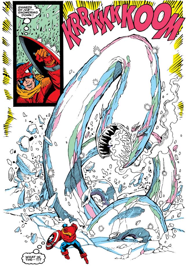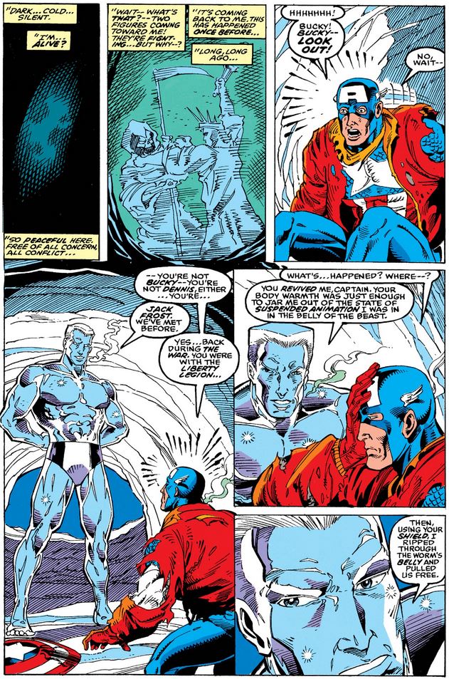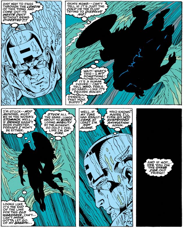 As he travels through the ice demon’s digestive system, Cap bumps into the man frozen inside, but before he can confirm his identity, he starts to pass out, acknowledging that this might be the end (or the beginning of another spell in ice for him).