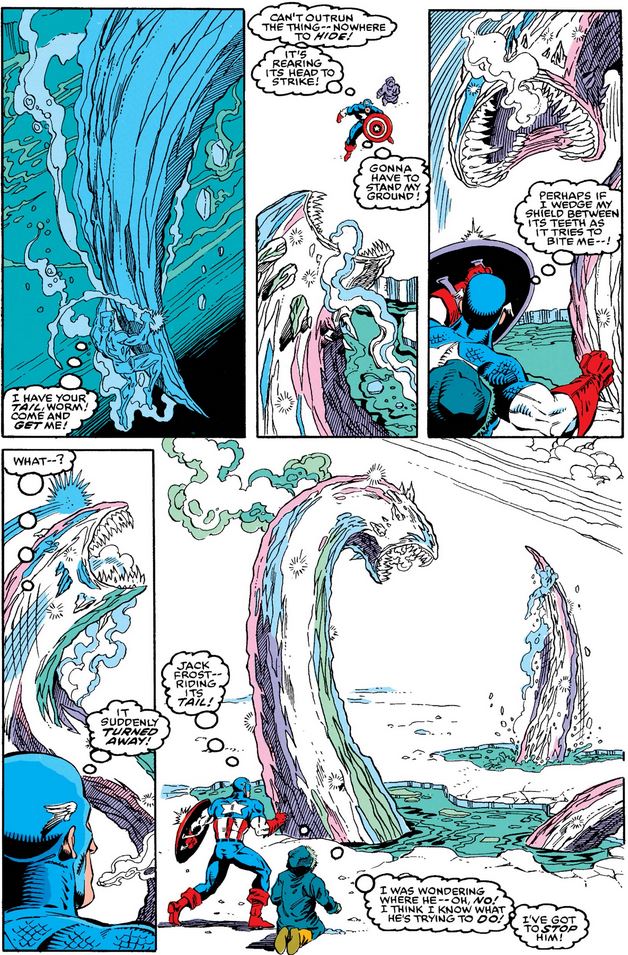 Cap prepares to counter the ice demon’s attack when it suddenly turns, and once he sees Jack, he knows what he’s planning and he commits to stopping him.