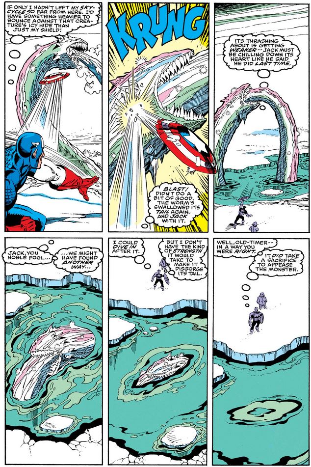 Jack sees a way to defeat the ice demon, but knowing all too well how Cap feels about self-sacrifice, he doesn’t let him know ahead of time.