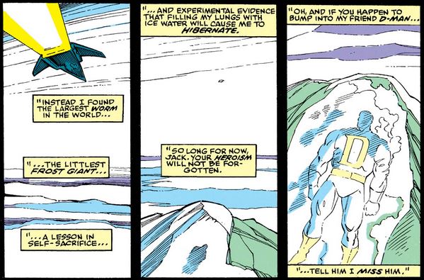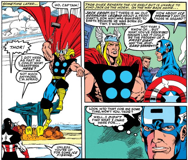 …which, as of the time of writing, has never been followed up on. In fact, aside from the occasional Golden Age flashback, Jack Frost has not been seen again, so we can only assume he’s frozen inside the ice demon once more, waiting for the next industrious Marvel Comics writer to haul him out. (Gee, wasn’t there a War of the Realms recently?)