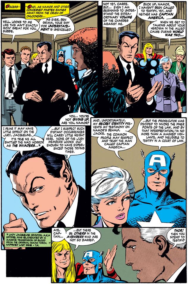 Either before and after his arctic journey, Cap appears in Namor the Sub-Mariner #13, where his fellow Invader (and sometimes Avenger) faces charges stemming for allllll his acts of aggression against the surface world. Cap would love to testify on his behalf…