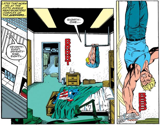 When we first see Cap, he is working out in the auxiliary Avengers gym… also known as his quarters.