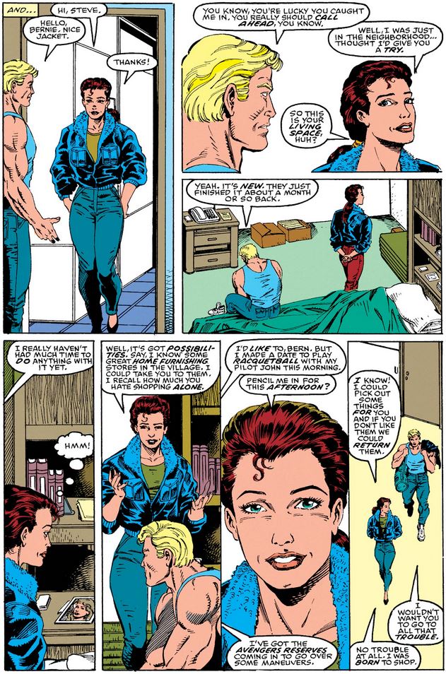 Back at the primary Avengers gym, Cap’s training the newbies (since Avengers #329) when Peggy tells him you-know-who is calling…