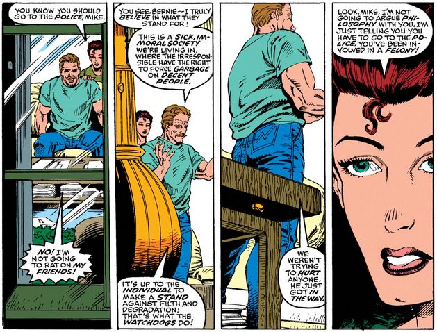 Cap also wonders what the Watchdogs would want with good ol’ Mike Farrel… who, at this very moment, is checking out the Watchdogs’ next target, an art gallery hosting a provocative modern artist. For his part, Mike warns them to be gone before trouble starts (obviously wanting to avoid a repeat of the death he failed to prevent earlier).