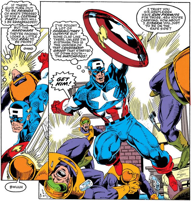 Captain America (vol. 1) #385, May 1991, “Going to the Dogs”: Mark Gruenwald (writer), Ron Lim (pencils), Danny Bulanadi (inks), Max Scheele (colors), Joe Rosen (letters). (More details at Marvel Database.)