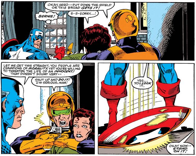 …until one of them finds Bernie and uses her to force Cap to stand down… on his shield. (He also wants to argue some philosophy, pointing out the contradiction between their moral code and what they’re willing to do to enforce it, but it doesn’t go very far.)