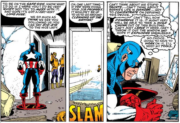 The Watchdogs set a bomb on the floor next to him—and imply he should be doing their job—before taking off with Bernie, which leaves Cap to play bomb squad. figuring out how to minimize the risk with very little information about how the bomb is set up.