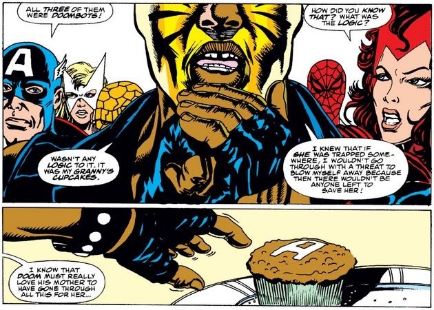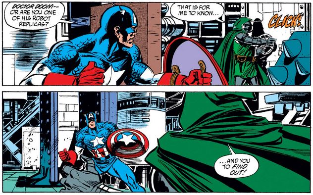 Doom both offers to reveal the flaws in the Avengers’ security—sorry, Tony—and reveals that the real Doom has a neutron bomb on his person, in case any hero becomes too violent. As Cap continues to fight with his Doom, though, he determines that he’s battling a Doombot…