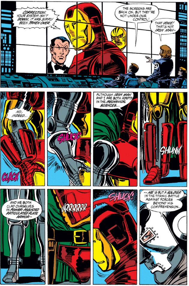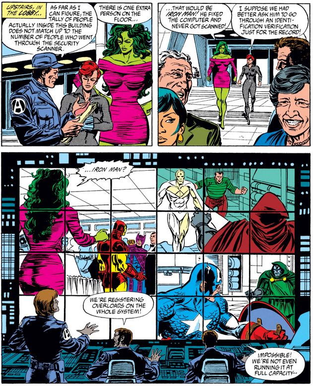 As Cap fights (a) Doctor Doom and Vision and Sandman also fight (a different) Doctor Doom, Black Widow and She-Hulk realize that Iron Man didn’t undergo the security scan, and the reason was indeed to hide his identity…
