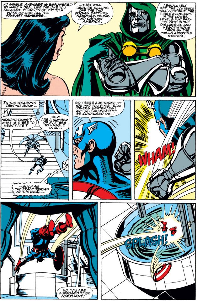 In Avengers #333 (with “starkly” lesser-quality art, unfortunately), the third Doom (who may or may not be the real Doom, although he claims one of the three is) states his intent: He wants to know the Avengers’ secret to interdimensional travel, which Thor bragged about at the end of the last issue, so he can travel to hell to save his mother (a frequent mission of his, seen most prominently in the graphic novel Doctor Strange and Doctor Doom: Triumph and Torment). And he is willing to hold the headquarters hostage and continue fighting Cap, Vision, and Sandman to get it—while negotiating, including talking like a Bond villain with Cap.