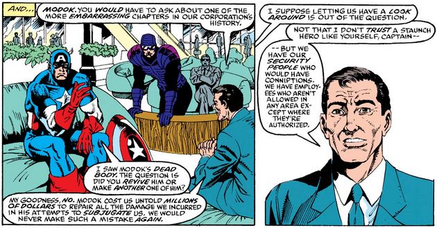 Back at the ranch, Cap notes that MODOK is dead, but is self-aware enough to know that he’s only “comic-book dead,” which is not the same thing. We also learn that MODOK’s creators, AIM, have supposedly gone legit, and Cap decides to check it out for himself.