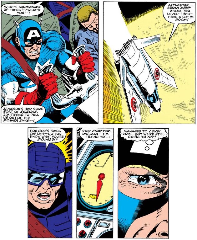 As issue #388 opens, MODAM has cut all the parachute lines, forcing Cap to ditch his chair and dive towards John’s.