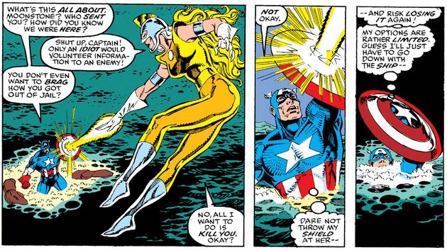 Cap tries to summon some Avengers to their aid (while being careful about the risk of repeated mind control), but before he can they are attacked again, this time by Moonstone and Blackbird, and Cap makes sure John is safe before engaging further.