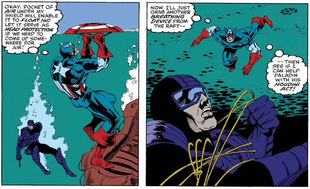 Because there is no life at risk this time, Cap is reluctant to let go of his shield again, and instead goes underwater himself…
