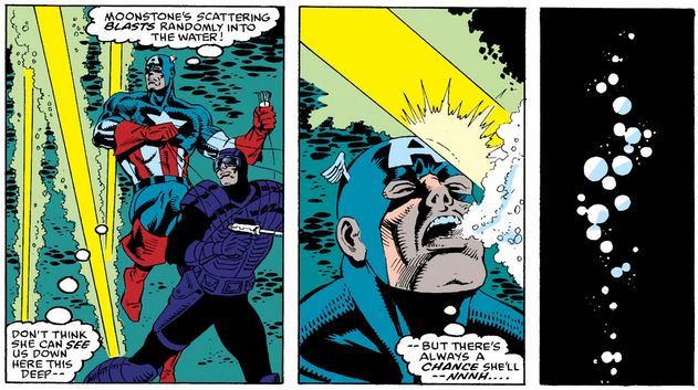 Captain America (vol. 1) #388, late July 1991, “Deep Sixed”: Mark Gruenwald (writer), Rik Levins (pencils), Danny Bulanadi (inks), Christie Scheele (colors), Joe Rosen (letters). (More details at Marvel Database.)