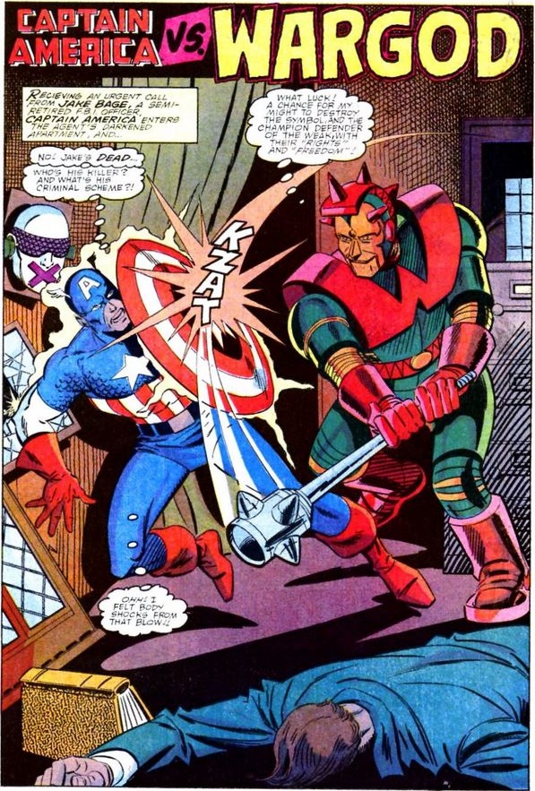 By the time issue #81 opens, Cap has come to and is fighting Wargod’s goons, despite not being 100% himself, and eventually getting away. (Sorry, make that “War God”—it seems to be two words now.)
