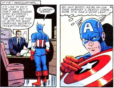 Cap then goes to visit Agent X-4, who is being attacked by Wargod and his men; after getting away, X-4 gives Cap a lead about General Hager (recently resigned) and Senator Weason, who are on opposite sides of the national defense debate, with the general favoring a strong, assertive military to project strength, and the senator arguing for a defensive rather than offensive stance.