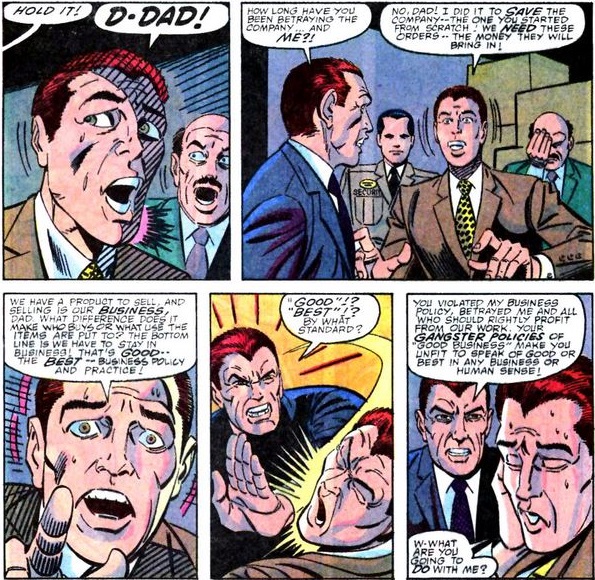 (I include the panels above for those interested in Ditko’s admiration of the libertarian philosophy of Ayn Rand, whose business ethics were more subtle than often realized; for more, see Christine Swanton’s chapter “Virtues of Productivity Versus Technicist Rationality” in the book I co-edited with Jennifer A. Baker, Economics and the Virtues.)