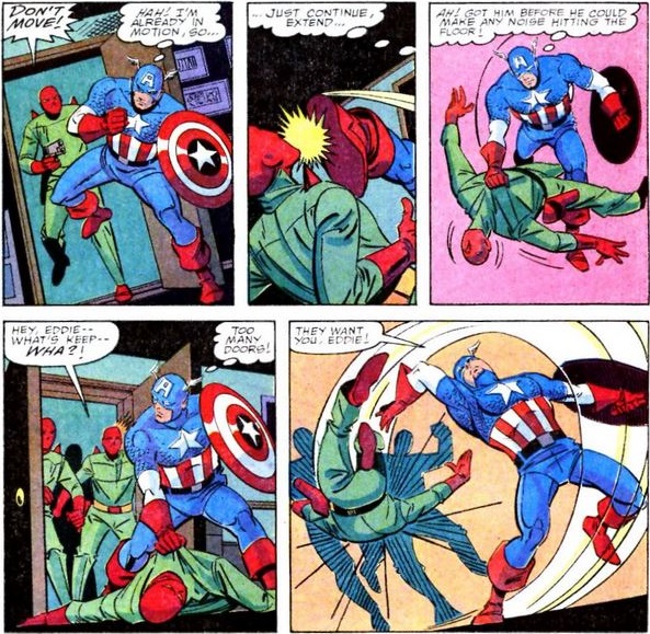 Below, Cap infiltrates War God’s lair and fights more of his thugs, being careful not to drop one too loudly before the rest appear anyway… and then letting them have him.