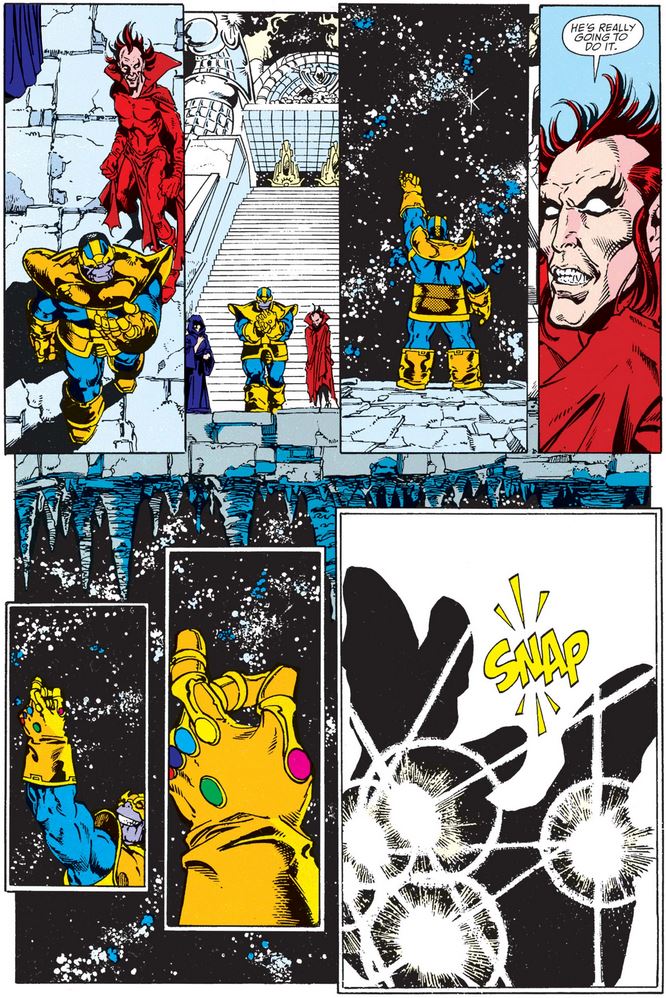 Infinity Gauntlet (vol. 1) #2, August 1991: Jim Starlin (writer), George Pérez (pencils), Josef Rubinstein (inks), Max Scheele (colors), Jack Morelli (letters). (More details at Marvel Database.)