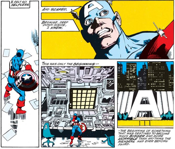 In issue #2, a number of the surviving Avengers gather at their headquarters, where Cap stands in front of a display of missing superheroes (including all of the Fantastic Four, curiously).