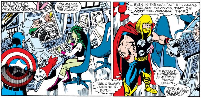 Note that Thor has apparently not met with Cap yet, as we saw in Thor #434, to explain that he is not the Odinson but Eric Masterson (in Thor’s body).