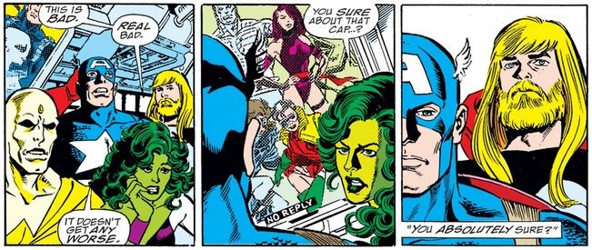 A frustrated Thanos finds Death unimpressed by his gesture, so he unleashes a psychic wave that wreaks destruction throughout the universe; on Earth, Iron Man and the West Coast Avengers see that “their side” of North America has fallen into the ocean, and Thor reports that Japan has suffered the same fate. Below, for some reason Nick Fury calls Thor by Cap’s nickname before checking in on the Avengers, who are reaching out for any help they can find…