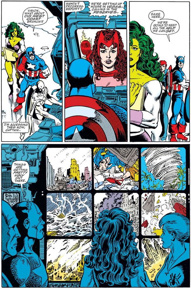 From this point we see an assortment of heroes witnessing the effects of the snap, starting with Spider-Man and continuing with Cap, starting with a mini-portrait at the top of the page which is reminiscent of Pérez’s brilliant work on DC Comics’ The History of the DC Universe.