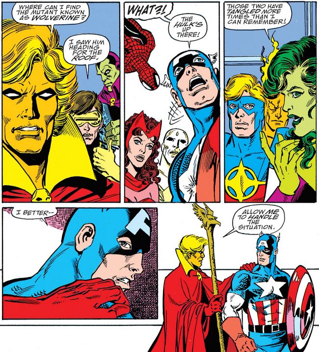 Warlock wants to have a chat with Wolverine, and when Cap realizes he’s on the roof with the Hulk, he fears the worst—such as more “dissension” in their ranks—but Warlock assures him he’ll handle it, and we can assume Cap is grateful for the help.
