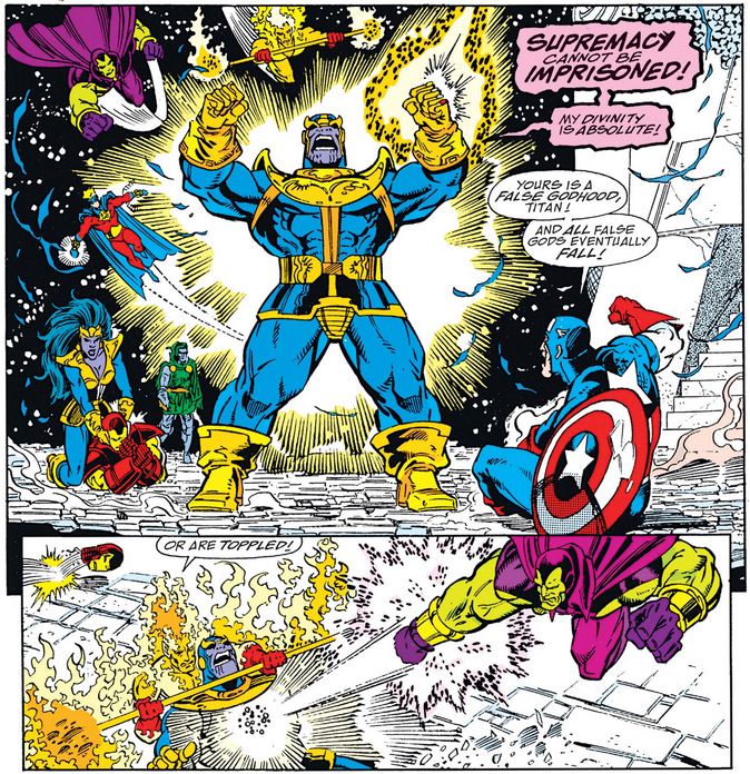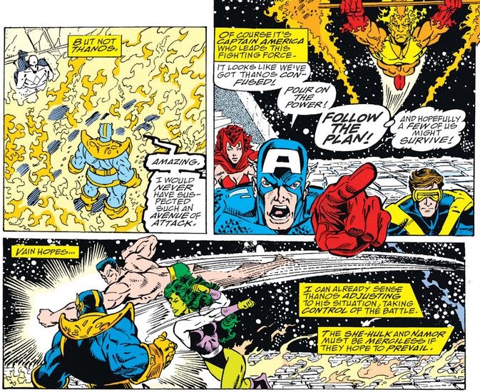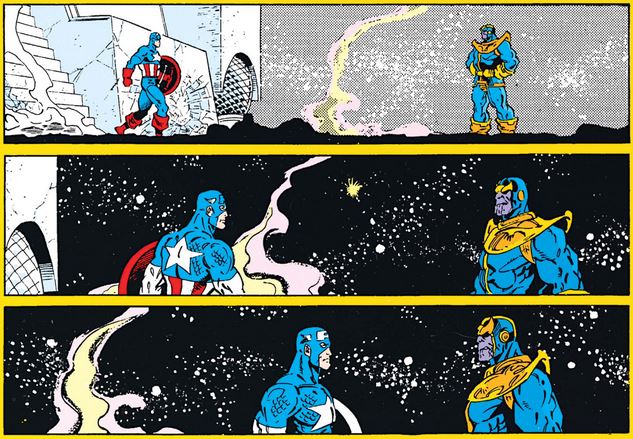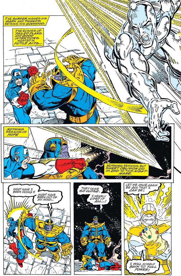 As Thanos raises his gloved fist to bring it down on Cap, the Surfer races from across the galaxy in an effort to snatch the gauntlet. In the end he fails; Cap gets one more blow in, but finally falls to Thanos’s power.