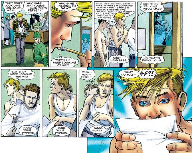 Here we see the familiar scene of Steve applying at the Army recruitment center, where he attracts some attention before he even starts filling out the paperwork…