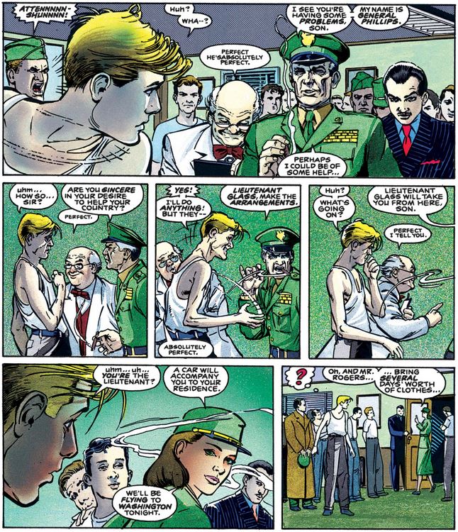 Two more familiar faces now join the scene: General Phillips and Dr. Erkskine (who thinks Steve is “perfect, just perfect,” although his reasons are left vague). Phillips make sure Steve is sincere in his desire to serve, and then passes him on to Lieutenant Glass, who we can presume is the unnamed female character (only called Agent X-13 or Agent R) in previous origin stories.