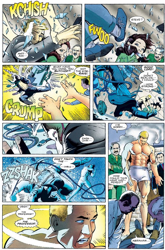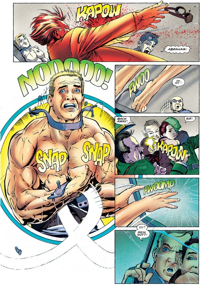 Afterwards, in Germany, the Red Skull—who is keeping close tabs on these developments—methodically assassinates the other men involved with Project Rebirth at the same time he tests a replicated version of the super-soldier serum on his own men (albeit without the benefit of the Vita-Rays). Meanwhile, the U.S. military works to hide its new secret weapon, who would rather fight than be hidden away (echoing a similar scene in Marvel Super-Heroes #3).